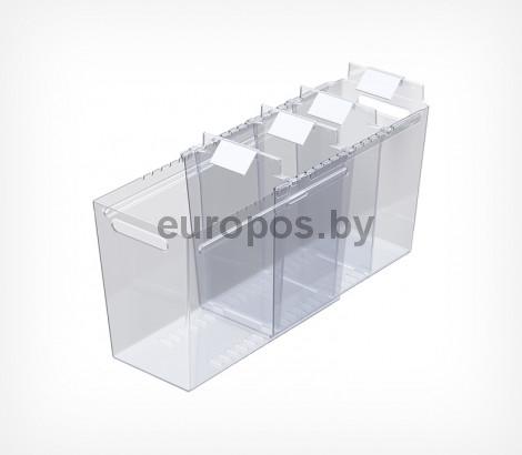 Раздвижной контейнер для идеального порядка в морозильных бонетах. Контейнер подходит для любых замороженных продуктов: в мягкой и твёрдой упаковке, а также на развес. Товары больше не смешиваются, а ценники всегда остаются на виду. Подвижные разделители позволяют адаптировать размеры ячеек под необходимый ассортимент за секунды. Специальный морозостойкий пластик выдерживает до -40°C и подходит для бонет глубиной до 700 мм (внутренняя глубина от передней до задней стенки).